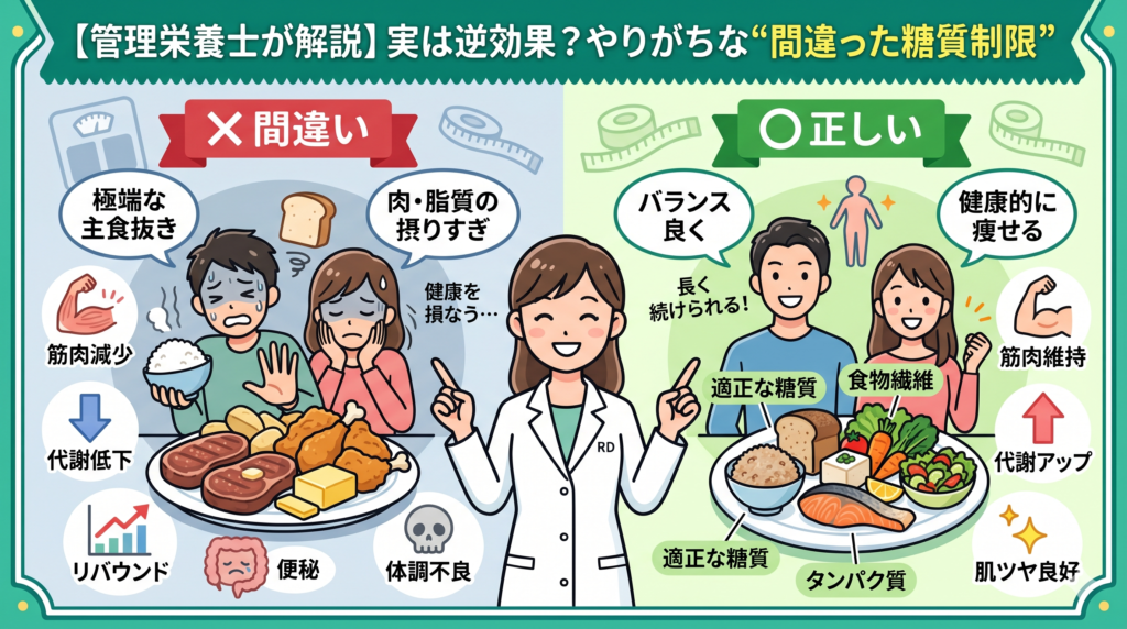 「いいと思ってやりがちな糖質制限の落とし穴」について解説します。